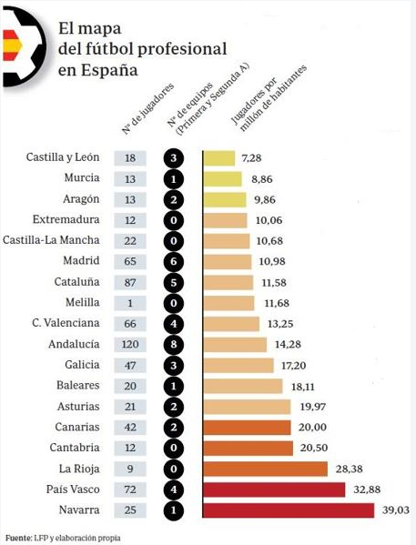 El diario ABC ha elaborado un informe analizando el número de futbolistas profesionales que juegan en España y su lugar de nacimiento. El dato es claro: Navarra es la comunidad que más jugadores de élite aporta al fútbol nacional en proporción a su número de habitantes pese a contar con un solo equipo en la élite. La región genera 39 futbolistas por cada millón de habitantes.