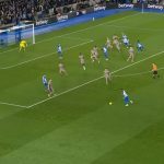 Esta disposición brindó muchos robos a Osasuna en campo contrario que conllevaron a acciones de gol claras, pero dejó muy expuesto al equipo en los desplazamientos en largo a sus dos extremos. El más perjudicado fue Moncayola, que se tuvo que medir en muchos 1vs1 con Vinicius a campo abierto y el Madrid generó mucho peligro con esto. Para poner en contexto, Moncayola fue regateado un total de 9 veces y perdió 15 duelos en todo el partido, demasiados, teniendo en cuenta el rival que estaba en frente. Fijaros en uno de los desplazamientos, la superioridad con la que atacaba el equipo blanco.